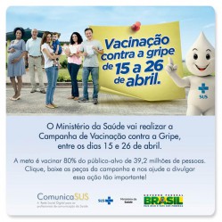 “Quem lembra da vacina se protege da gripe” . Essa é o tema da campanha nacional de vacinação contra a influenza (gripe). A Prefeitura, através da Secretaria Municipal de Saúde, desde segunda-feira, 15, disponibilizando nos postos de saúde vacinação para gestantes, pessoas com 60 anos ou mais, crianças de 06 meses e menores de 02 anos, mulheres no período de até 45 dias após o parto, pessoas portadoras de doenças crônicas, indígenas e trabalhadores de saúde.